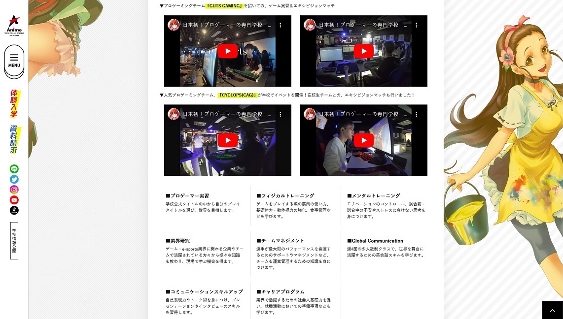 This degree is catered according to the student’s needs, which depend on what he wants to do in the industry, from being a pro gamer to a tournament event organizer and host. It has the highest level of facilities among anime and esports-related colleges in Tokyo, and not only teaches game skills as a pro gamer, but also teaches everything to become a pro gamer, such as mental and physical training as an esports player, and team management skills. It even includes education about coaching skills which can be used after retirement as training resources.