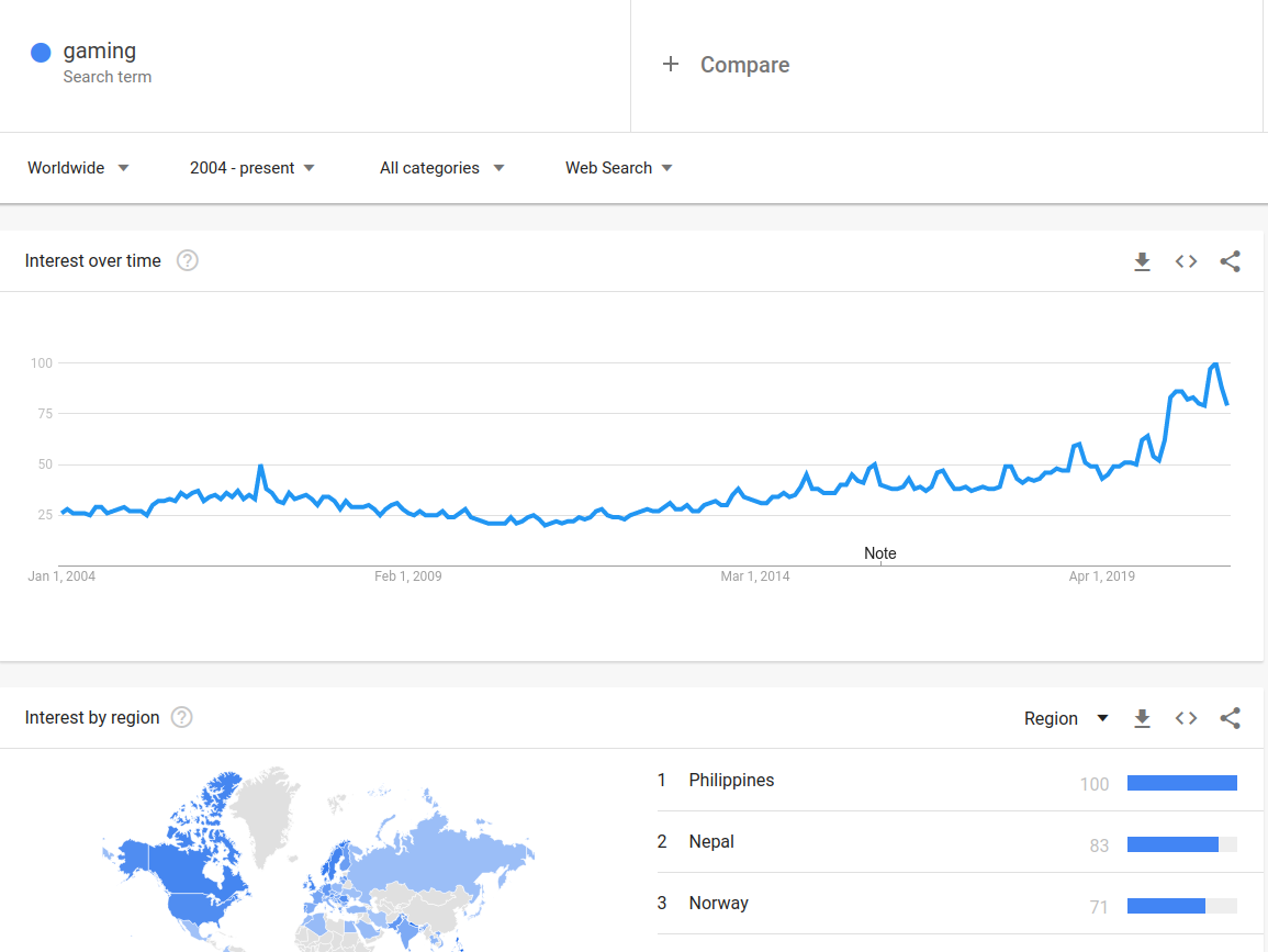 Oppositely animes are doing great and gain lots of popularity after 2019. Strange, if animes are doing great, anime games should gain popularity as well but it is decreasing alone. This means that either people lost their interests in gaming, OR, anime game developers make poorer anime games. In order to determine which one is correct, we need to research on how gaming is doing as well.