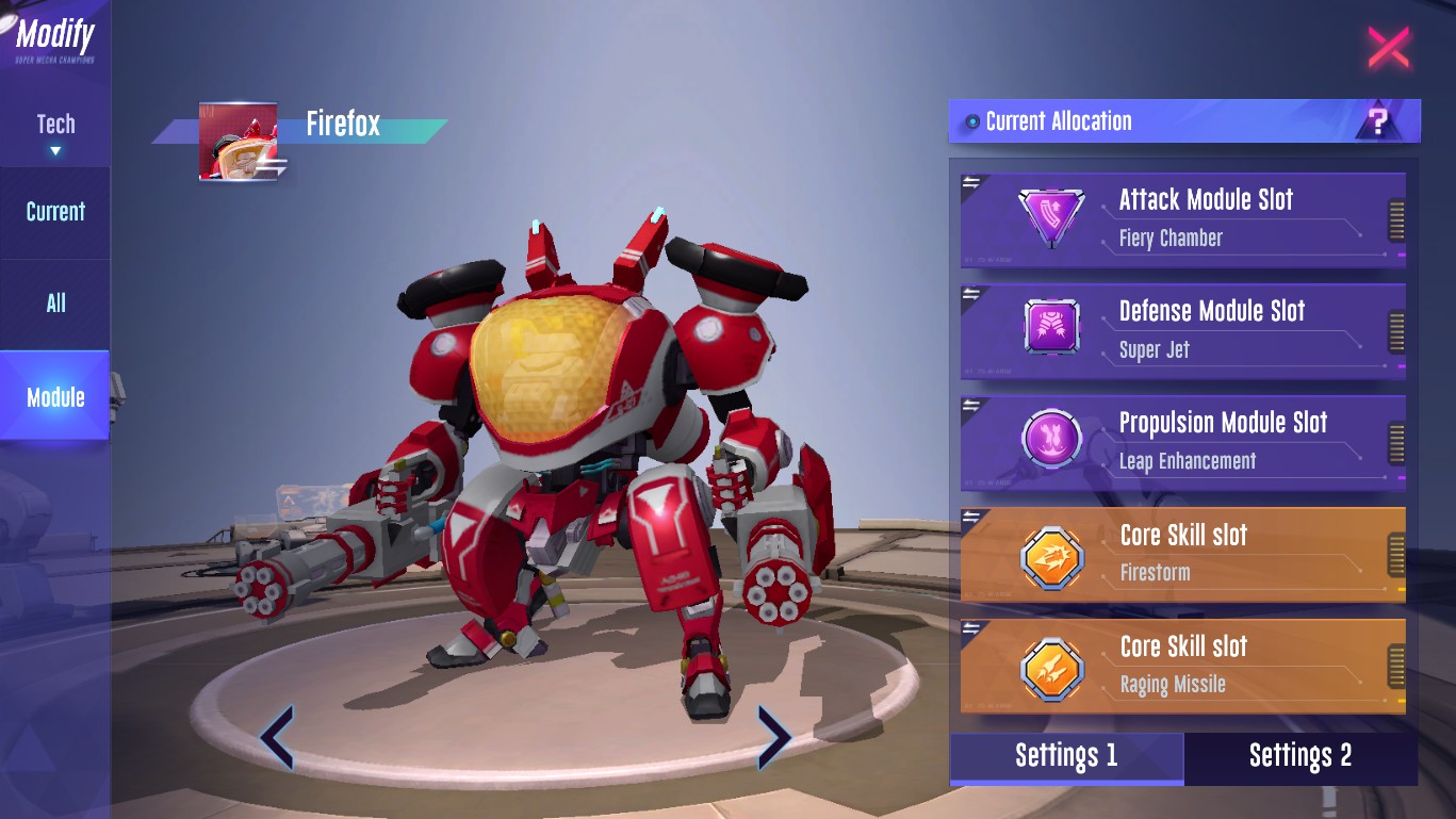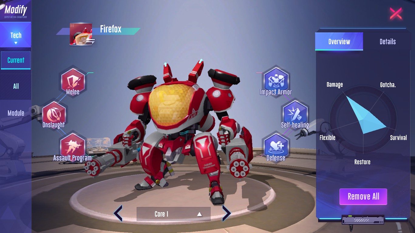 The techs he set up were designed to increase the damage he caused at short distances, ideal for fighting those enemies with a lot of mobility. While I also thought about adding some tech to increase Foxy's DUR, in case he got to fight too annoying enemies.