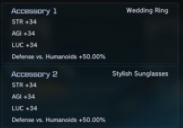 Each of the accessories give +34 Str,+34 Agi,+34 Luc and +50% humanoid defense so with two of them you reach 100% humanoid defense making you almost invincible your only weakness is status aliments but we will get to that.