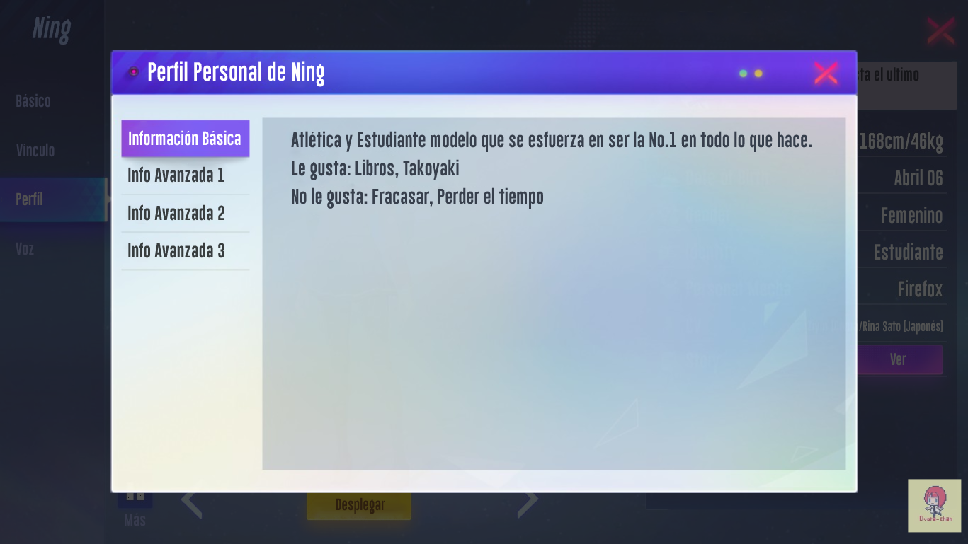1. Cuando intentaba darle significado a "Bond", no sabia como ponerlo... ya que la palabra hace referencia un "lazo" o "enlace" entre dos personas; pense en ponerlo como "Afecto", pero se salia mucho de contexto... Lo deje en "Vinculo", se entiende que tiene que ver entre tú (Usuario) y le personaje (El piloto / Ning).