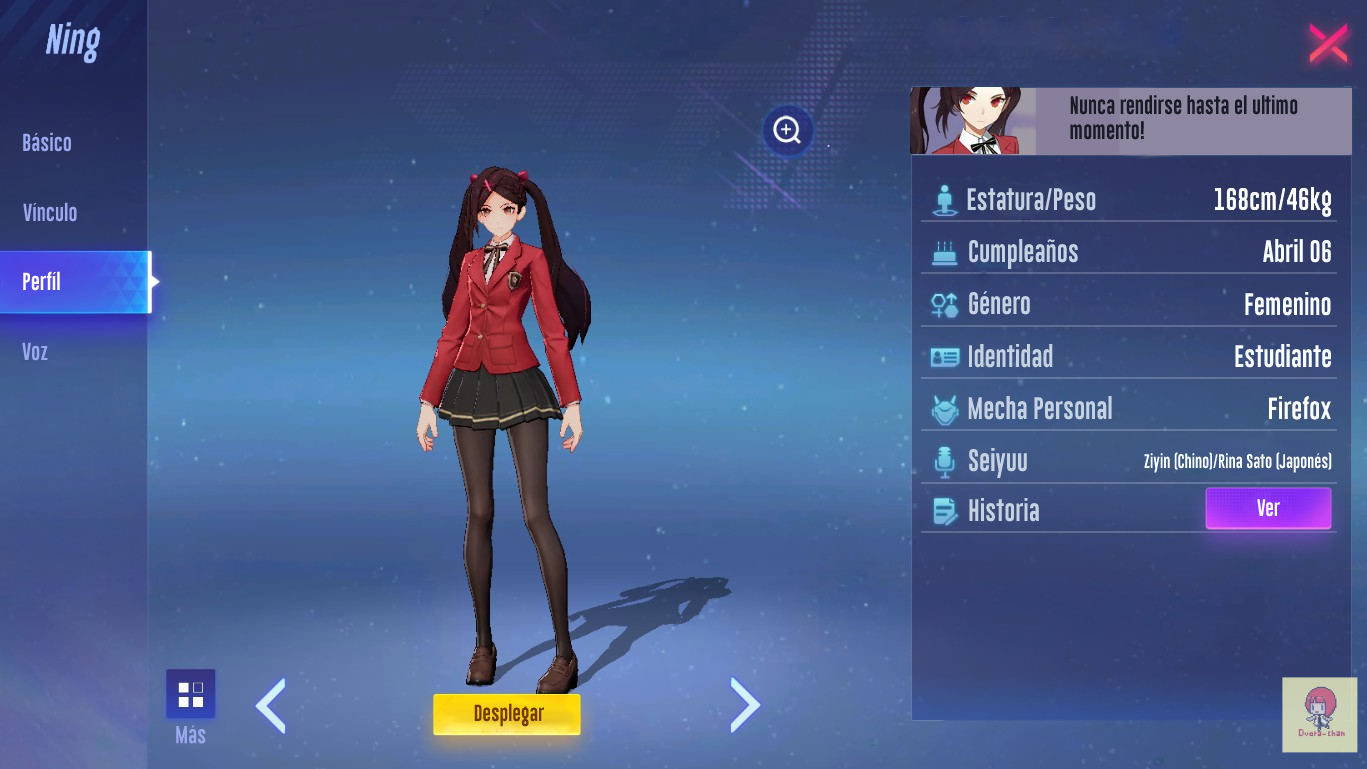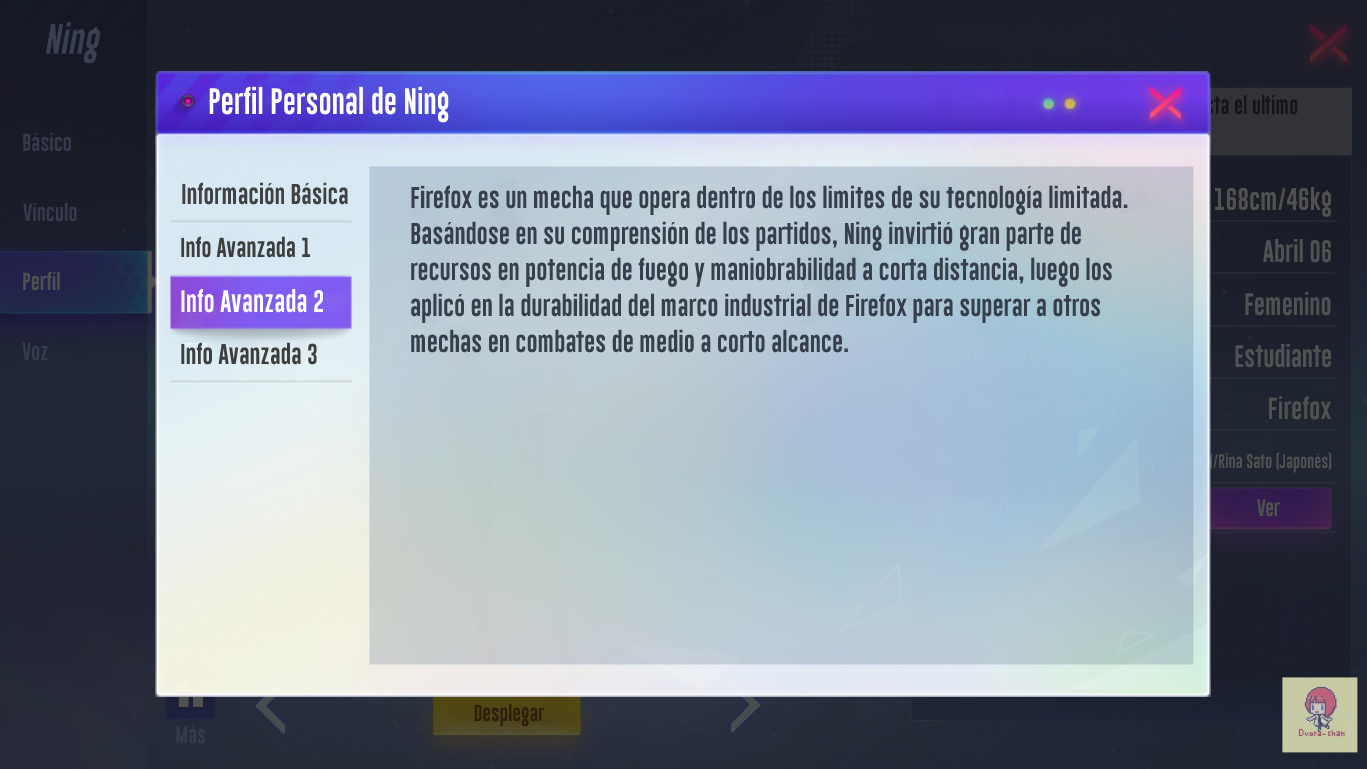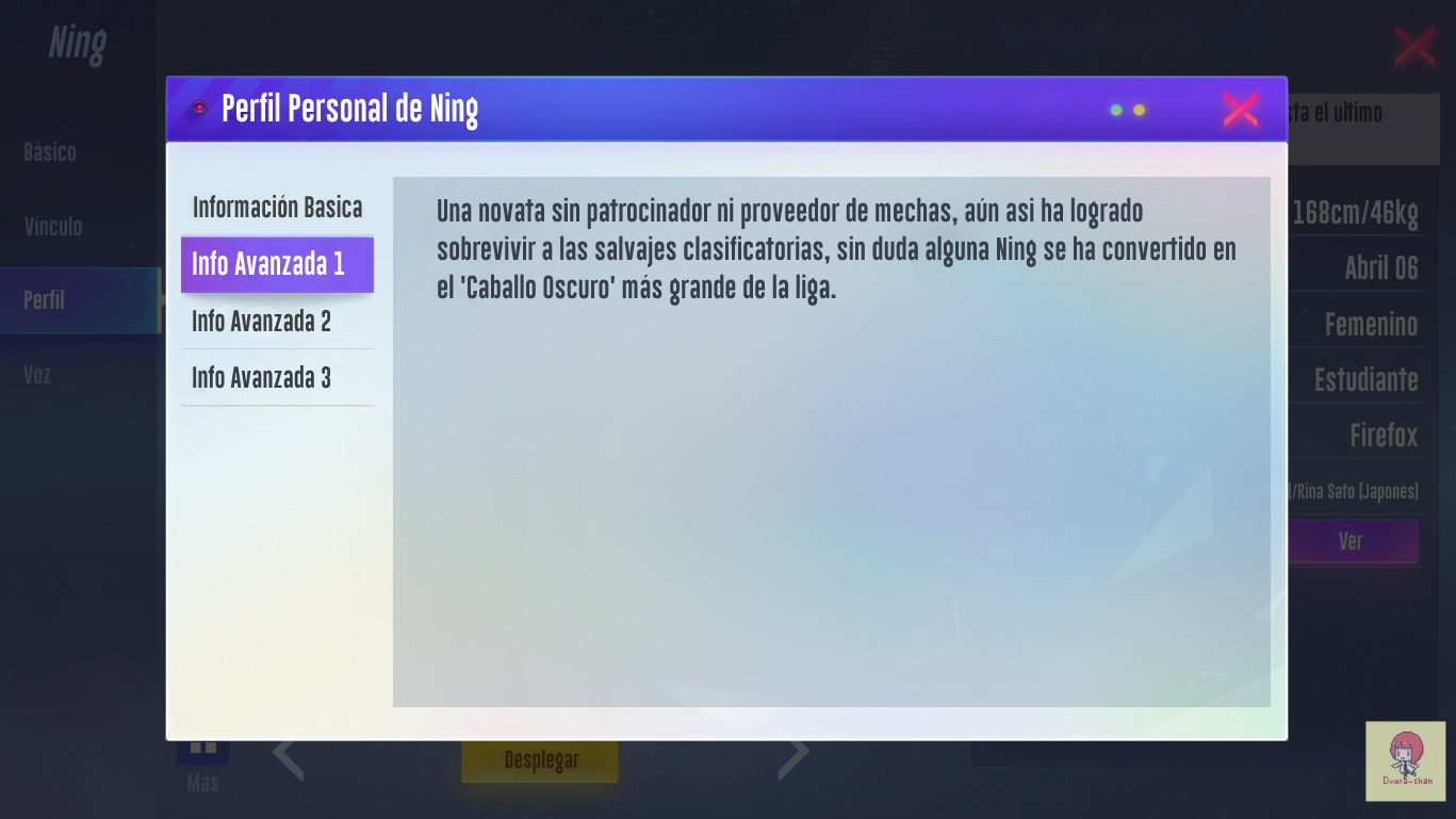 - Cuando intentaba darle significado a "Bond", no sabia como ponerlo... ya que la palabra hace referencia un "lazo" o "enlace" entre dos personas; pense en ponerlo como "Afecto", pero se salia mucho de contexto... Lo deje en "Vinculo", se entiende que tiene que ver entre tú (Usuario) y le personaje (El piloto / Ning).