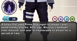 The role type your going to equip will be Defense this boost your defense and health a great deal and allow you to use defensive ninjutsu, next  for your weapon your going to equip the Scientific Ninja Tool "Double Moon Sword: Zero" yes that entire thing is the name of the weapon. This weapon is fast and allows the user to make up for the defense types weakness of being slow which is great for survivability and damage. Next up is the Ninja tool that you'll be using which is the Blast Bomb the reason being that it can be trown directly or trown on the ground to set up your opponent, the explosion also has good range letting it hit multiple target. Now for what armor you'll equip, your top will be the Sasuke Outfit 2: Top  so you can get the First Blood skill which makes your special charge faster, next your bottom will be the Boruto Outfit Bottom for the Clear Mind skill which reduces ninjutsu cool down time. Lastly for your accessory you'll  equip the Anime Series 20th Anniversary Costume (Sasuke) which gives you the Battle Hardened skill which heals you every time you get a kill. All together this allows you to keep your defensive and healing skills up, lets you reach your special quickly and heals you while you fight.