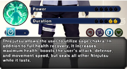 Your ninjutsu are going to be Demon Hunter which unleashes a charging slash that heals you based on its damage but also gives you an aura that stops you from flinching. Next on the list is Suano'o Armor which gives you an auto block that can't be broken and lets you fight while blocking. For your substitution jutsu your using Time Space Hop which after teleporting you away from danger your cool downs are reduces and you become invulnerable for a short period of time. The final thing is your secret technique or special depending on which you like to call it, which will be Snake Sage Mode, upon entering this form all your health is healed, your health is increased, you attack, defense, and speed are boosted but you can use your other ninjutsu. This all grants you self healing, invulnerability and no flinching all while allowing you to reduce cool downs and not stop attacking