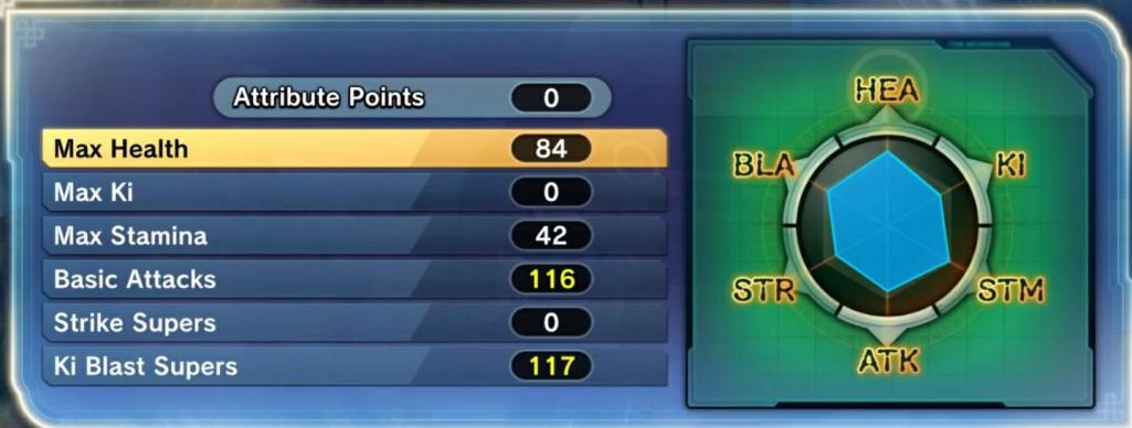 Now for our stats. At level 99 you want to have 84 in max health, 42 in max stamina, 124 in basic attack and 125 in ki blast supers. The reason for this is that 42 in stamina is enough for a extra stamina bar, which will be useful. 125 in ki ensures that we do near max damage with our skills, 124 in basic attacks mean we have made the weak base attack stat we start with way better, making it pretty high now. lastly we want as much health as we can get as it will help us to make up for our low base health. We dont need to invest in max ki as our QQ Bang boosted it by the amount we need and our ki is constantly recovering due to our super soul. And we wont invest in strike supers as were not using any in this build. (The example image i show you wont be in the exact stats i described as this character is only level 92, when i max it out to 99 i will update the image.)