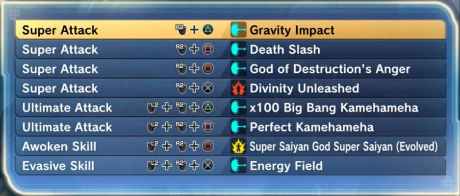 The skills we will be using are simple. For our supers were using "God Of Destruction's Anger" for its decent damage, long range and instant stamina break which lets us combo or escape from our opponent. Our next super is "Death Slash" which is a quick energy slash that knocks opponents back and opens them for combos. Super number three is "Divinity Unleashed" which charges our ki and also gives us a buff that increases ki gained from all sources which boost our auto ki recovery from our super soul. The last super is "Gravity Impact" which fires a quick blast that blast enemies away and keep them locked in falling for a good while, long enough to to charge up ultimates even if they have a long charge time. We will be using "Perfect Kamehameha" as its easy to combo into, is long ranged and has some of the highest damage in the game, you can use this from any position as it has great tracking. Our secound ultimate is "x100 Big Bang Kamehameha" which does the catastrophic amount of damage and if you turn of lock-on you can sweep from side to side as you fire, its best to position yourself at the the same elavation/height as your opponent as its hard to aim it down or up if they are far away. We will be using the "Energy Feild" evasive as it blocks all attacks even ultimates and can be kept up for as long as you want if you have the ki for it, and our auto ki recovery, recovers ki even when using it so we can keep it up for a good while and wait out most attacks. Our transformation skill will be "Super Saiyan God Super Saiyan (Evolved)", as it is one of if not the best Saiyan transformation in terms of damage. Much like regular "Super Saiyan God Super Saiyan" this transformation greatly reduces Ki gain from attacking or receiving damage and the user's Ki is gradually drained, but at a much faster rate in the evolved form. This form gives a 35% increase to all damage which is 10% more than regular ssgss, an 18% decrease to Ki recovery which is 8% more than regualar ssgss, as well as a 10% increase to damage resistance which is 5% more than regular ssgss. Our super soul's auto ki recovery in combination with the buff to ki gained from "Divinity unleashed" practically negates the ki drain of this form, removing its one weakness. With its weakness gone we are left with a form that boost our already high attack and gives us a needed boost in defense.